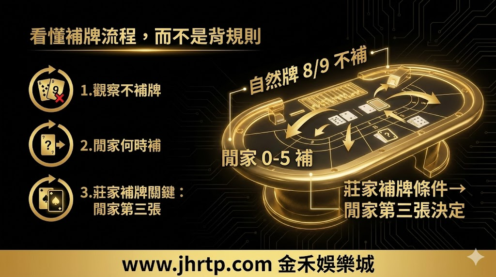 這樣實際看過幾十局後,補牌規則會自然記在腦中,比看表格有效得多。