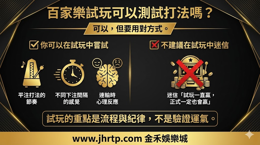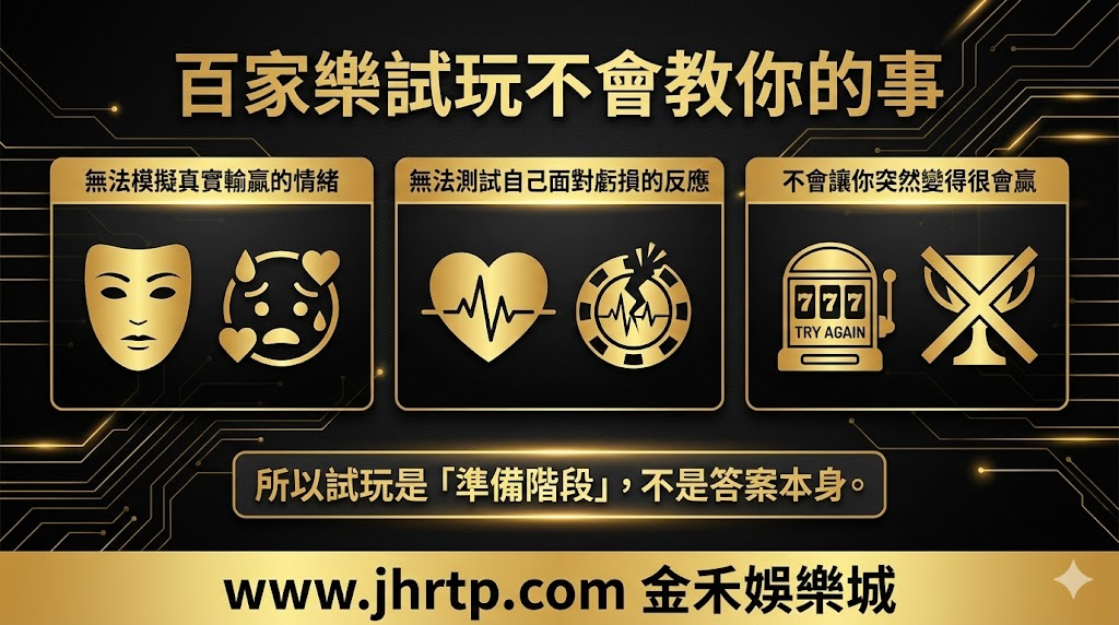 百家樂試玩教學完整整理,說明百家樂試玩的用途與實際玩法,幫助新手在不花錢的情況下熟悉下注流程、補牌規則與遊戲節奏,並順利銜接到金禾娛樂城等線上百家樂平台。